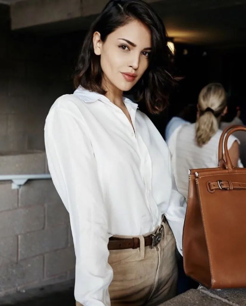 最经典的纯白衬衫与条纹衬衫,eiza亦能演绎出慵懒性感与干净利落的混合气质。