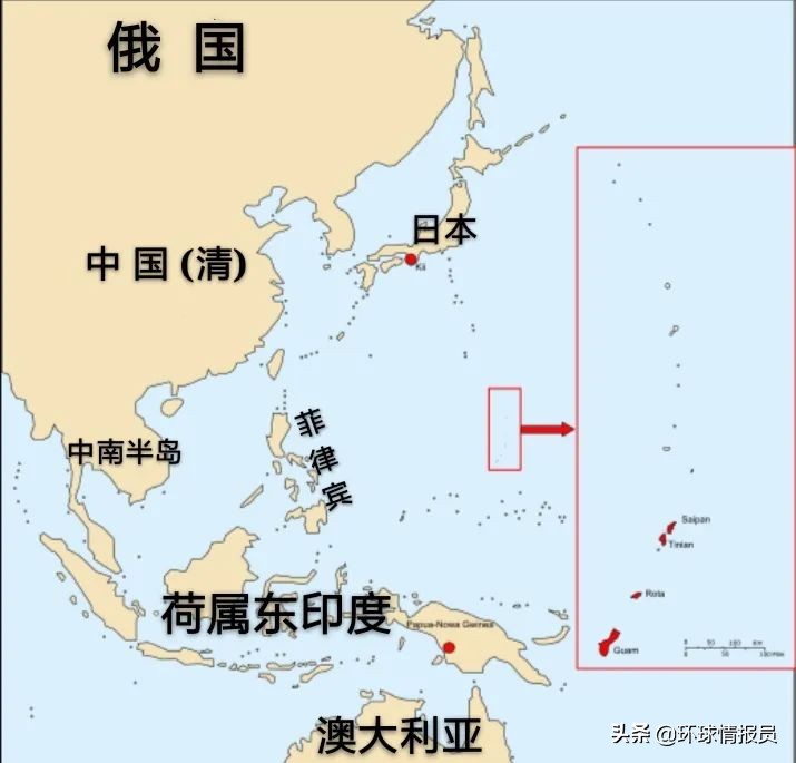 ▲西班牙实际控制的马里亚纳群岛(红框区域),行政中心在最南部的关岛