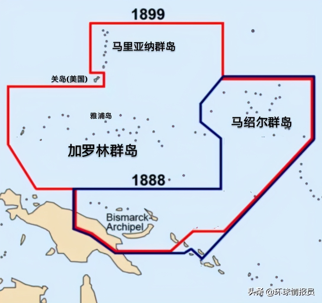 ▲1899年德国新获得的马里亚纳群岛和加罗林群岛被并入了德属新几内亚(蓝线为1888年德国-西班牙旧分界线),而关岛则被美国占据