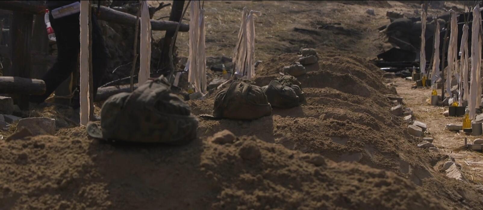 根据曝光的概念画,中间还有一段他们下葬战友的戏,万里跪在战友的尸体前,其他人严肃地站在旁边,火堆旁还有其他战友的坟头。还有另外一场疑似小村信号塔大战后的下葬戏也被删除。
