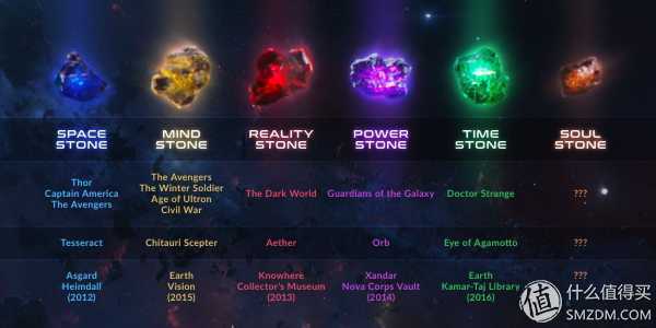 原来,之前我们讲到的宇宙灵球、宇宙魔方、洛基权杖和以太粒子。这四样神器正是四颗无限宝石的容器。分别对应着紫色的力量宝石、蓝色的空间宝石、黄色的心灵宝石和红色的现实宝石。如今,四颗神石的能力和容器都已大白于天下,只有时间宝石和灵魂宝石下落不明。