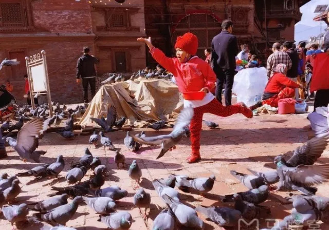 ○ 与小动物互动,为照片增添动态的活泼感。鸽子大概是加德满都最常见的存在了。