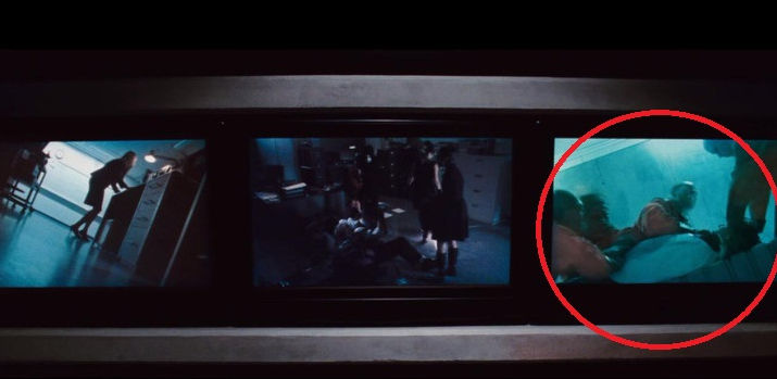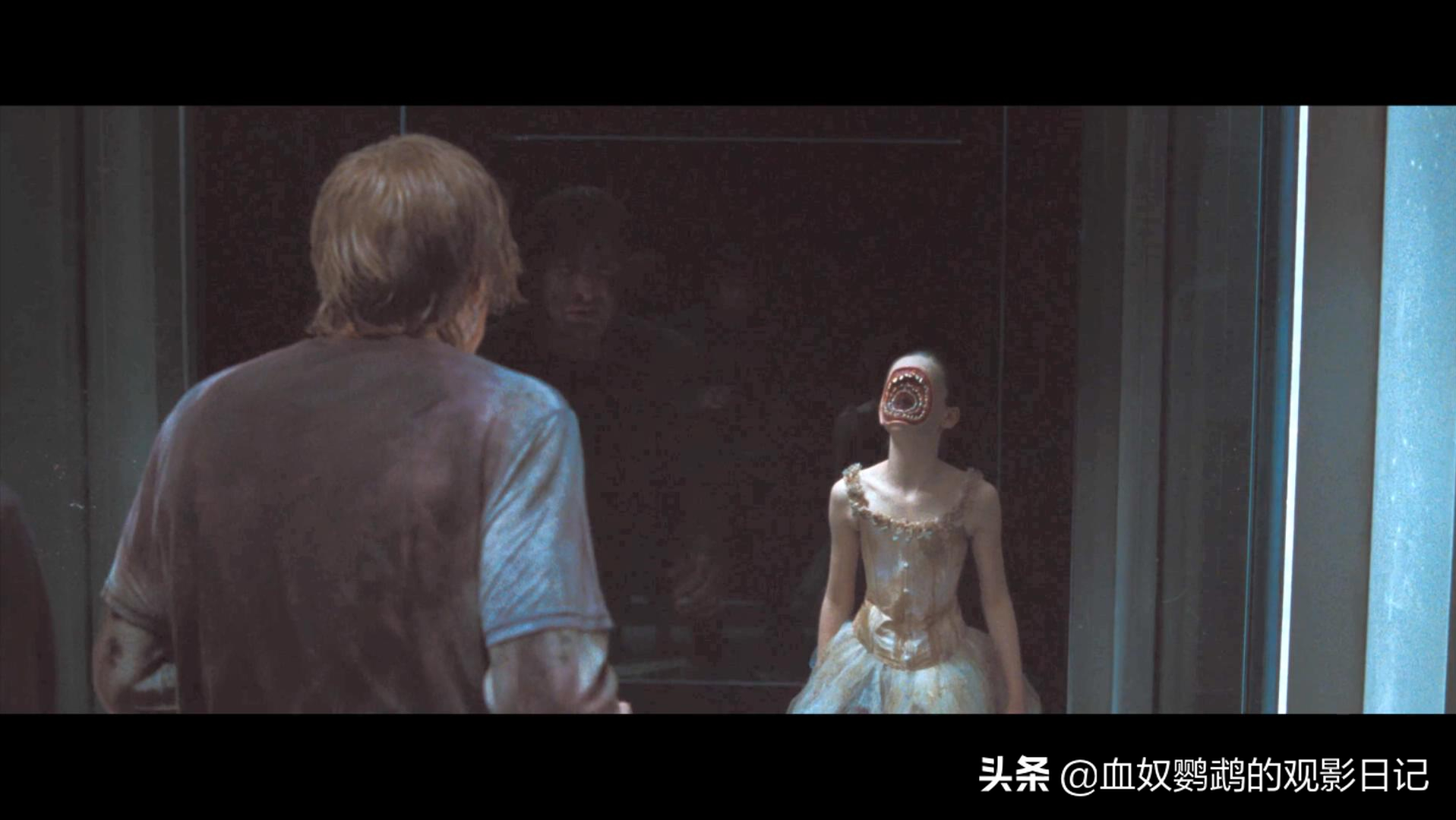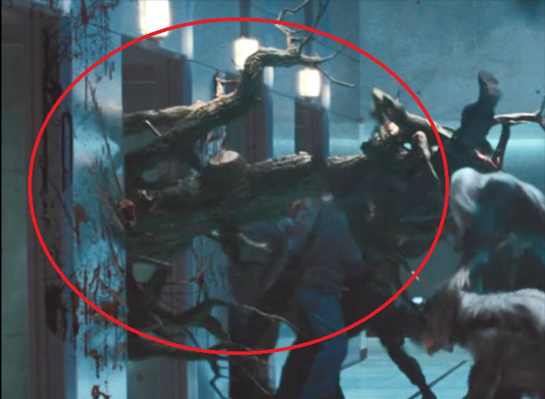 电梯门打开后,从画面左边靠中间的那部电梯中伸出树根,抓住一个倒霉士兵又缩回电梯,随即喷出一片血雾。