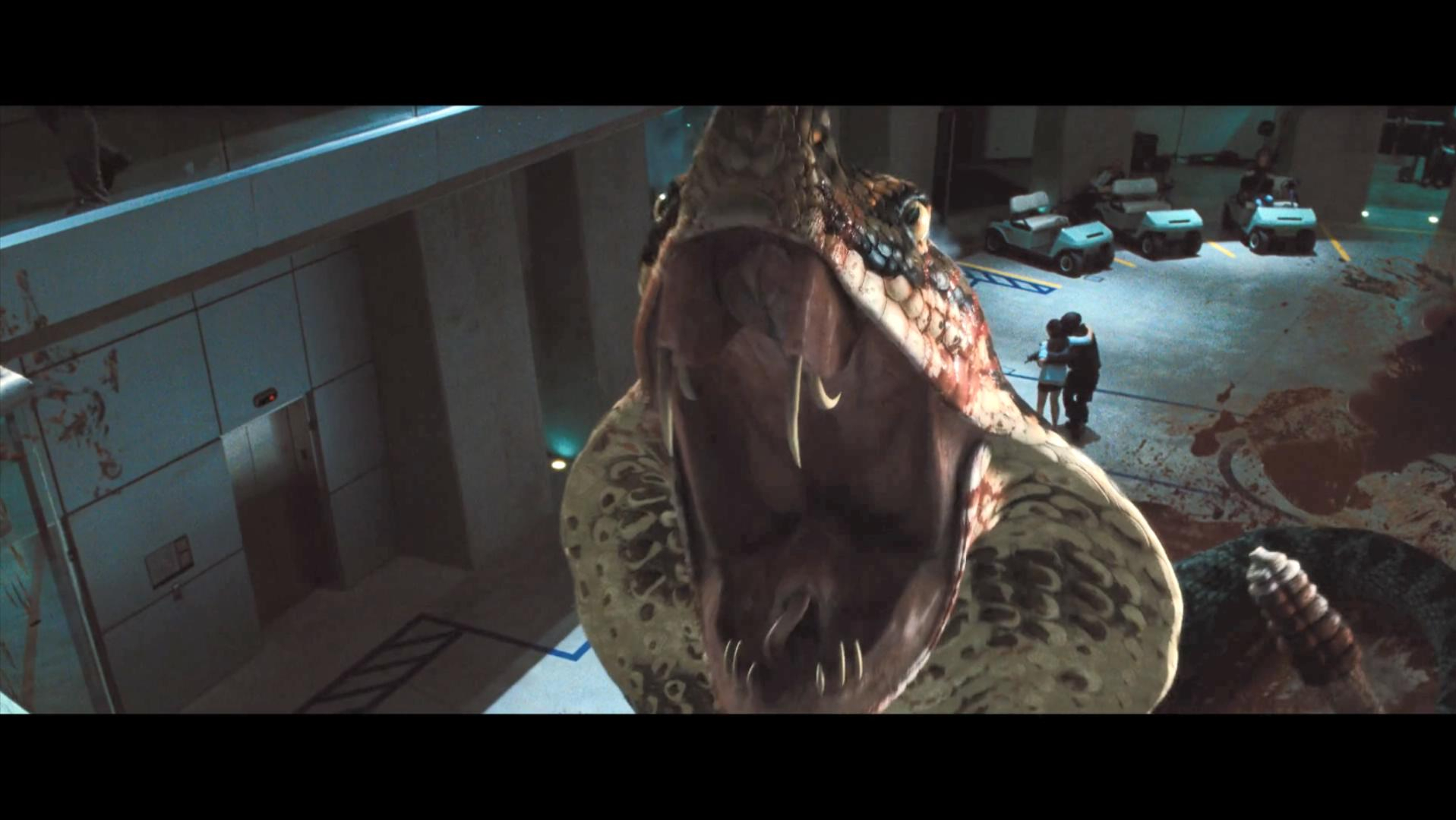 电梯开门时右边最里面一扇门中冲出来,先是卷住一人,然后再活吞一人 。随后的怪物混战中,这只巨大的眼镜蛇拥有一个特写。