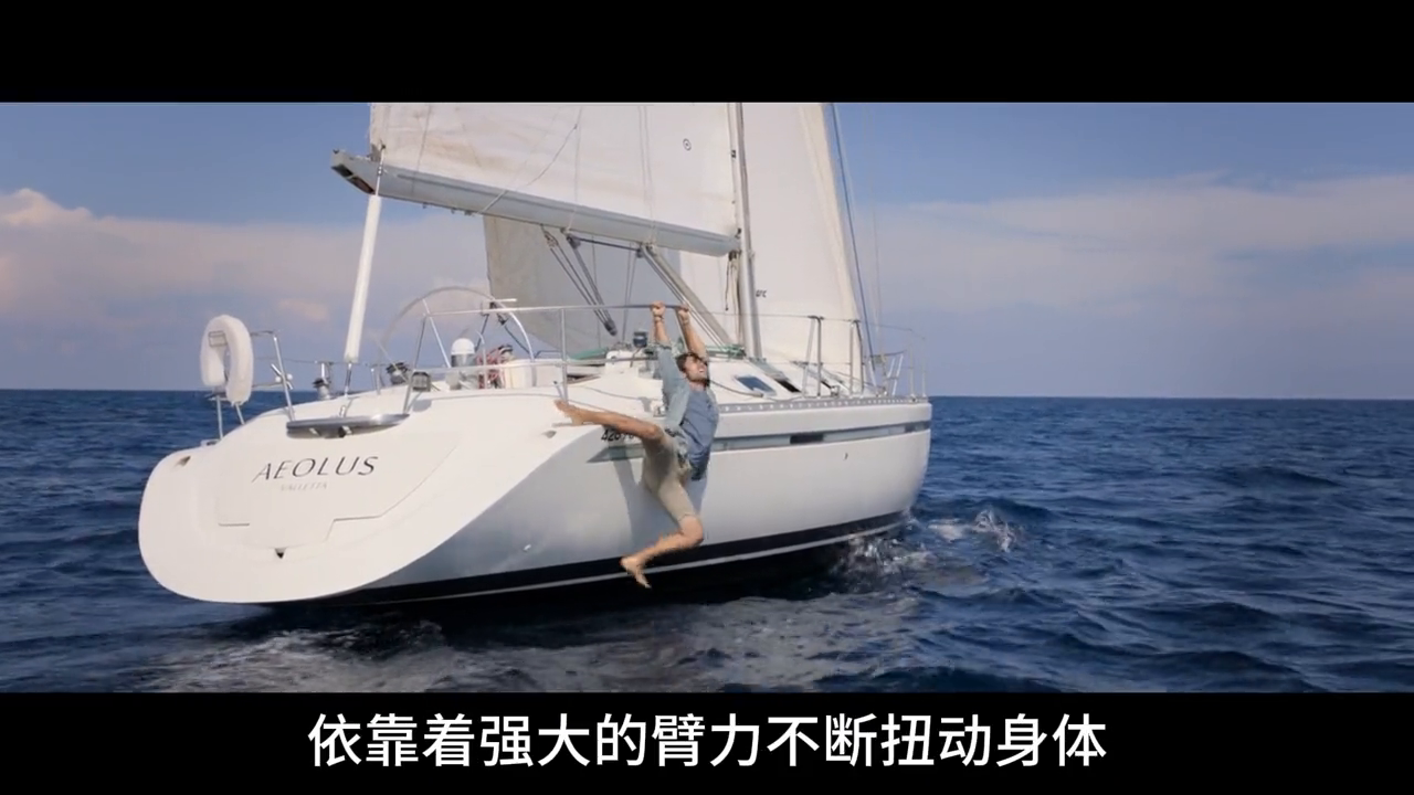 见此情景男人还是快速地冷静下来,依靠着强大的臂力不断扭动身体,紧接着伸出右腿使劲勾住船体努力扭动整个身体爬回游艇。然而还没等男人放松一会刚才就夺门而出的尿意又再次来袭。