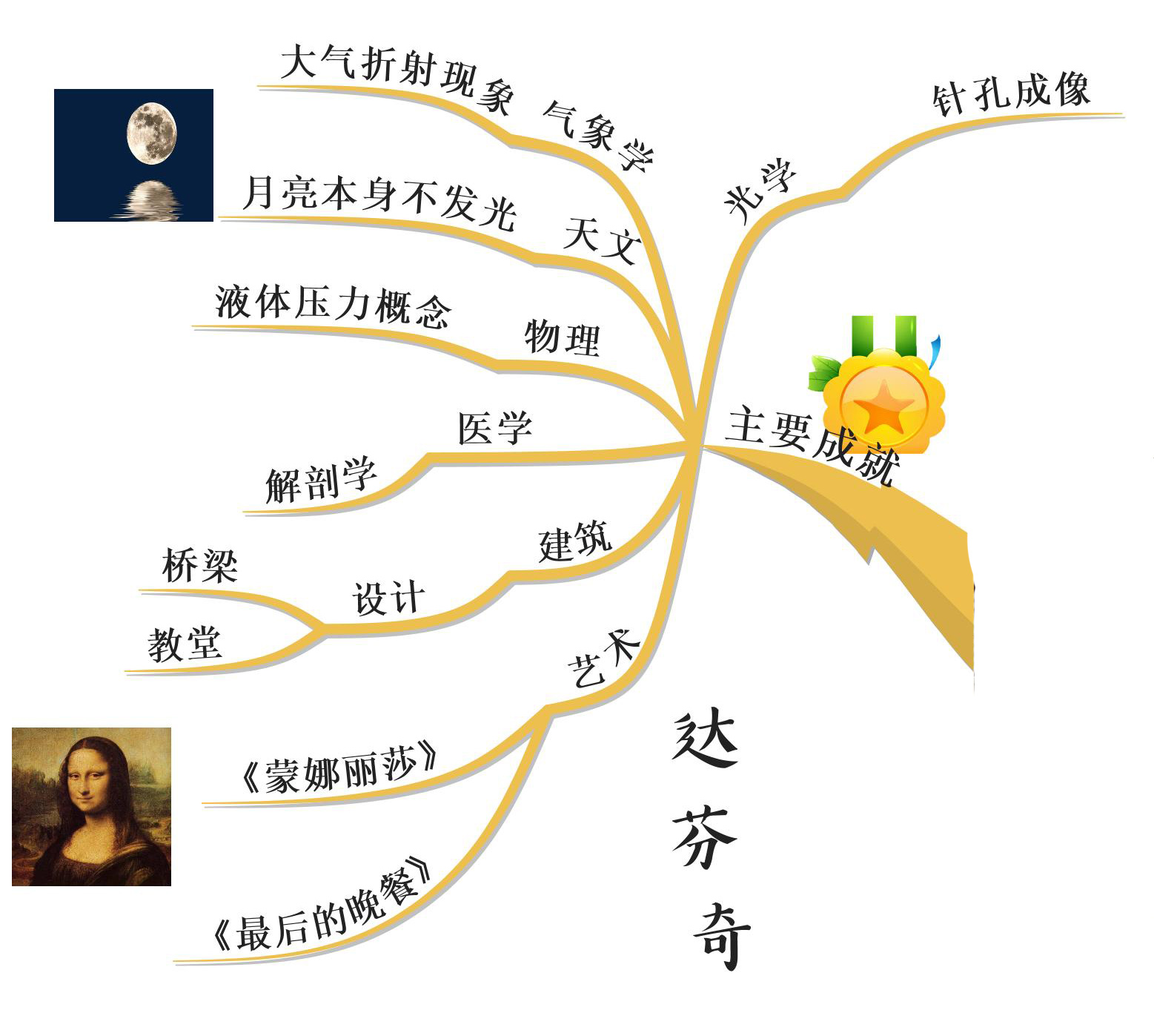 在天文学方面他比伽利略早60年提出月亮并不发光,在物理学方面,他发明了液压的联动器装置,发现了惯性原理,发展了杠杆理论。