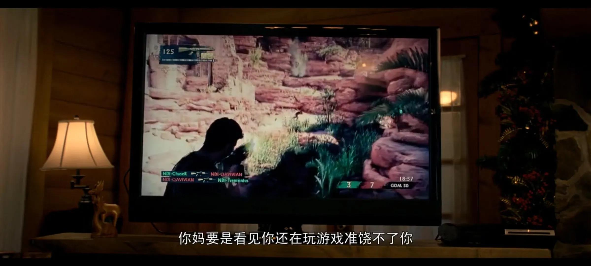 回到电影中,麦克·班宁正在和总统儿子康纳针对打游戏问题交谈的时候。我们可以看到其头上带有一顶美国国徽帽子,手上所持应为sony(索尼)公司的ps3手柄,显示屏中可以看到当时所游玩的游戏为顽皮狗公司的《神秘海域3:德雷克的诡计》。