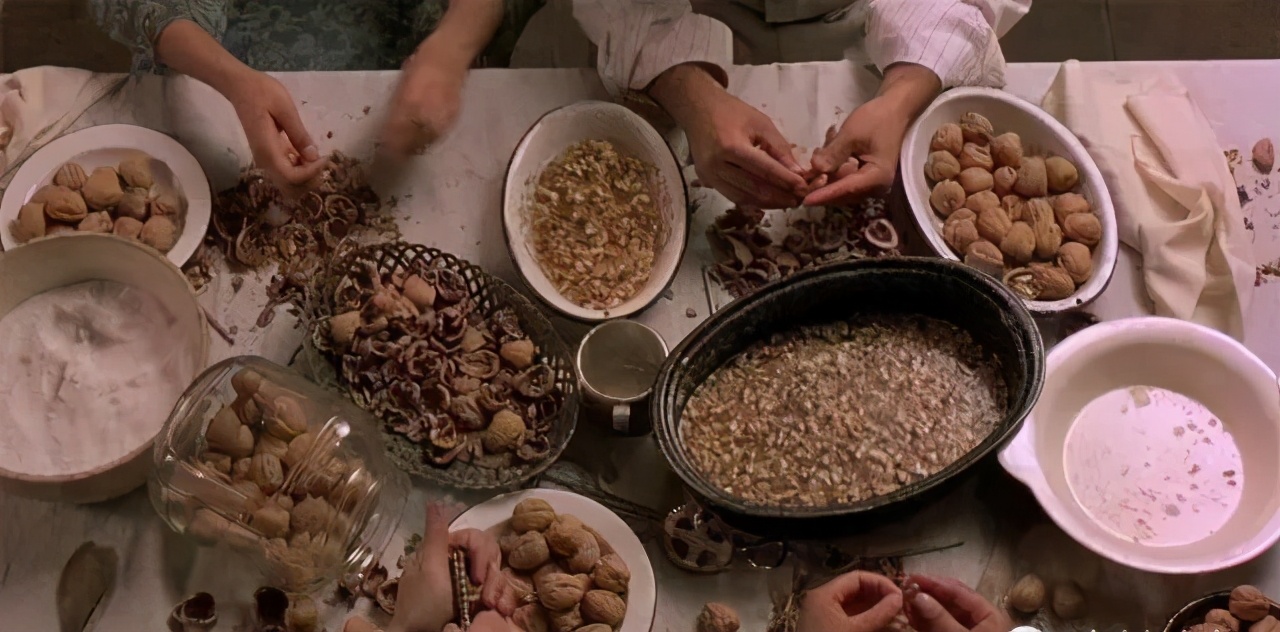 最后这道菜,叫做“核桃辣椒酱”,是在大姐和佩德罗女儿的婚礼上。辣椒在火上烤熟,去焦皮,填入核桃坚果馅料,浇上酱汁,最后,撒上石榴,这道菜让所有的人无不情欲大发。