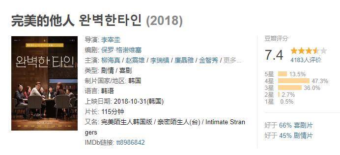 都说翻拍毁经典是一个不变的定律,然而这部电影却打破了这个定律,《完美的他人》目前在豆瓣上的评分是7.4,评论中也几乎零差评,那么,打破翻拍定律的这部电影究竟有何魅力呢?