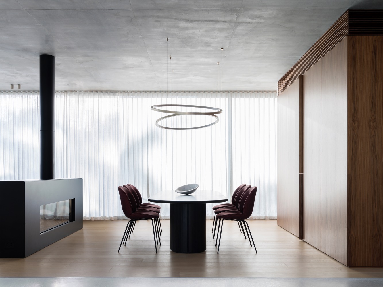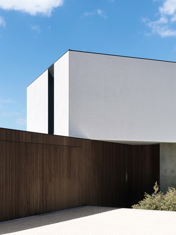 三个体量相互成一定角度,根据场地的不寻常形状,捕捉景观并创建几个外部区域,每个区域都有自己的功能。其中两卷位于地面。第三个盘旋在其他上方,在下方留下一个负空间。这个负空间包含中央核心功能:入口、厨房和流通。从这个区域开始,其他一切都分叉开来:车库和娱乐区的体积向东悬挑在原生草地上,并集中在灌木丛和海港上;西边的生活空间位于两个花园区之间,略高于第三个花园空间,并专注于远处的海港。悬停在上方的第三卷在一侧有一个坚固的立面,保护它不受俯瞰的邻居的影响,