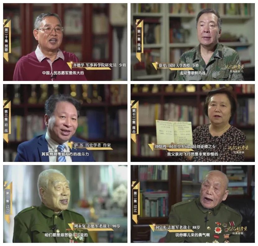 与此同时,《记忆的力量·抗美援朝》先后采访了包括志愿军老战士、名将亲属、专家学者等在内的16位嘉宾。“以表现志愿军长津湖战役为例,我们选取了电视剧《三八线》中冰雕连壮烈牺牲的片段后,又加入了志愿军老战士的独家专访。当九旬老人作为历史见证者回忆70年前零下30度的极寒下如何浴血奋战时,口述历史的真实性大大增强了节目的感染力。”乔鲁京说道。