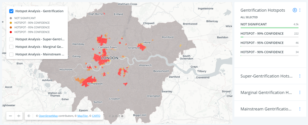 深入的空间分析确定了具有统计学意义的、独特的中产阶级社区热点及其不同的类型,如下图所示: