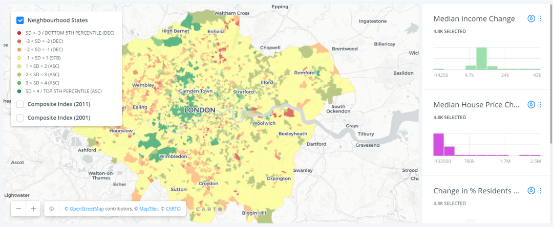 分析表明,两个大的邻域变化过程——邻域上升和下降——共产生了1351个lsoas,占全市lsoas总量的近30%。除了伦敦金融城,没有哪个行政区能幸免于这些过程,因此凸显了伦敦发生的社会空间转变的广泛性。