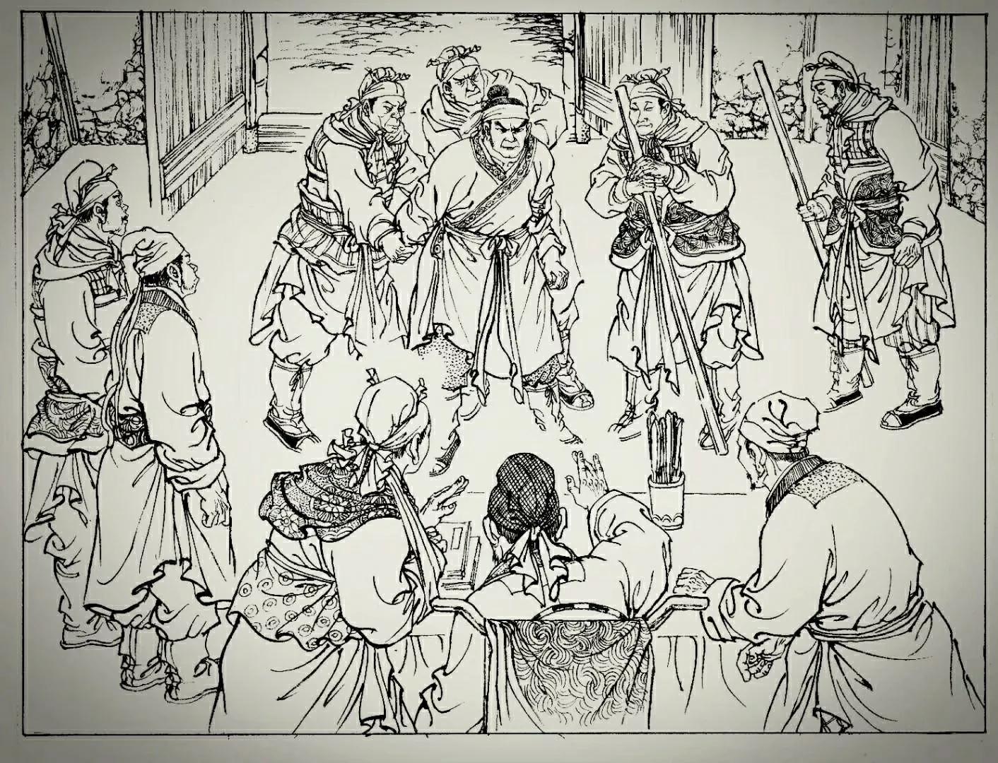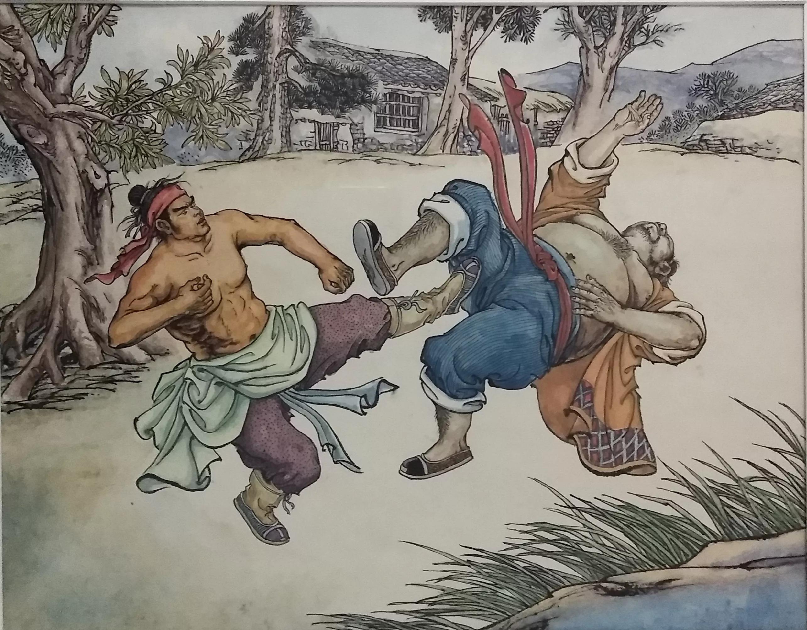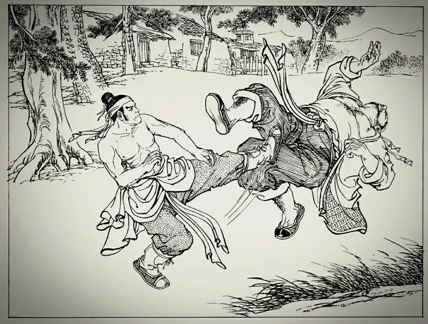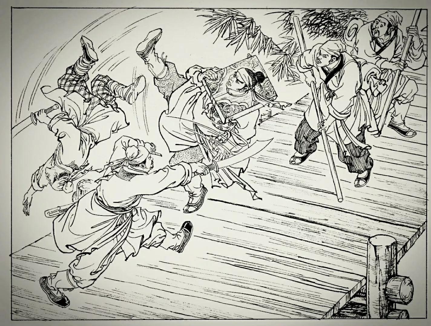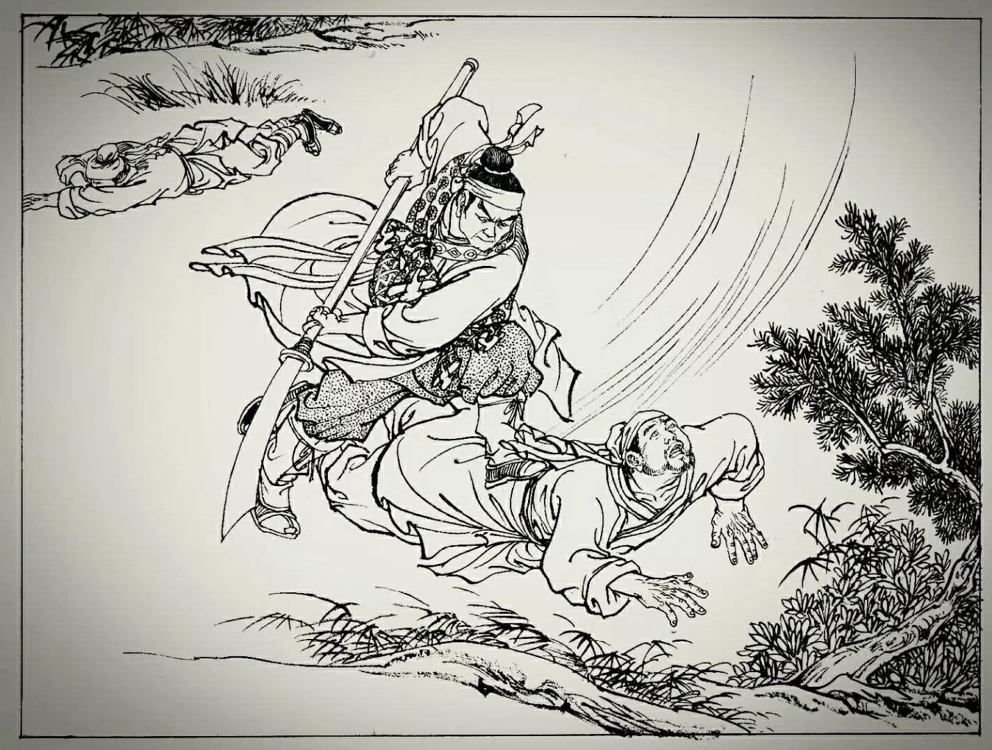 武松被押解,逶迤来到飞云浦地界。前有俩公差,后有张团练派来俩杀手,四人前后包夹,欲置武松于死地。岂知武松早有警觉,当下劈开枷锁,三下五除二,轻松撩到四人。