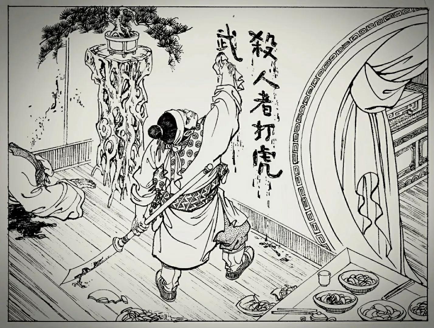 武松杀了几个仇敌,犹难解心头愤恨,沾鲜血于墙上大书:杀人者,打虎武松也!