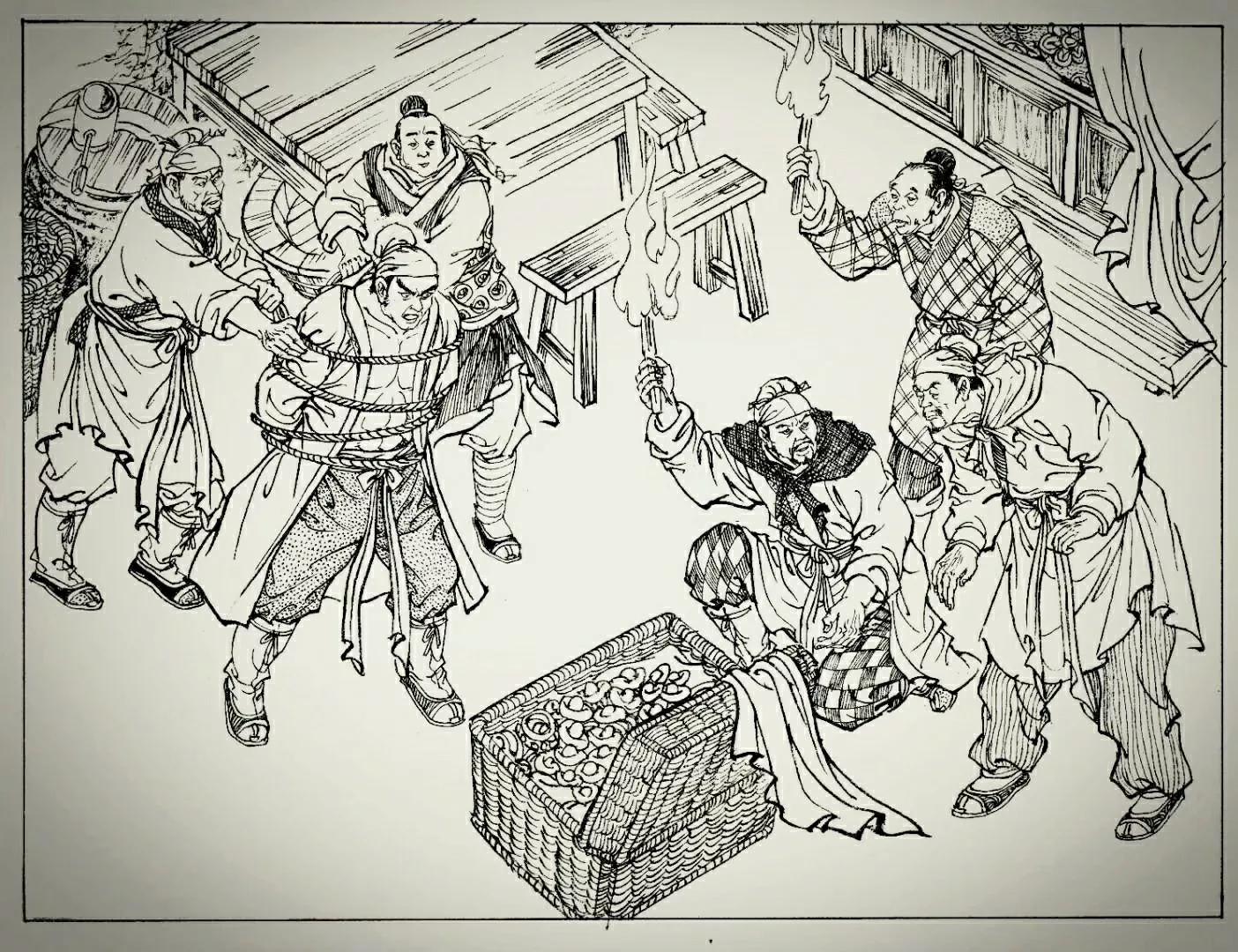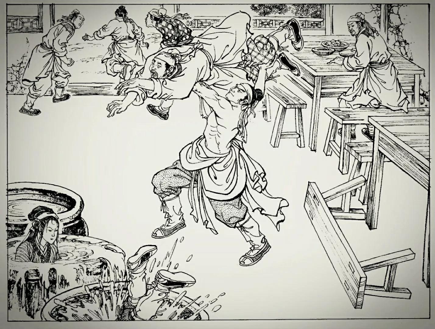孙二娘早在酒里下了蒙汗药。此刻正站在门边,朝着武松三人鼓掌连呼“倒也,倒也”。俩公差和武松应声倒地。