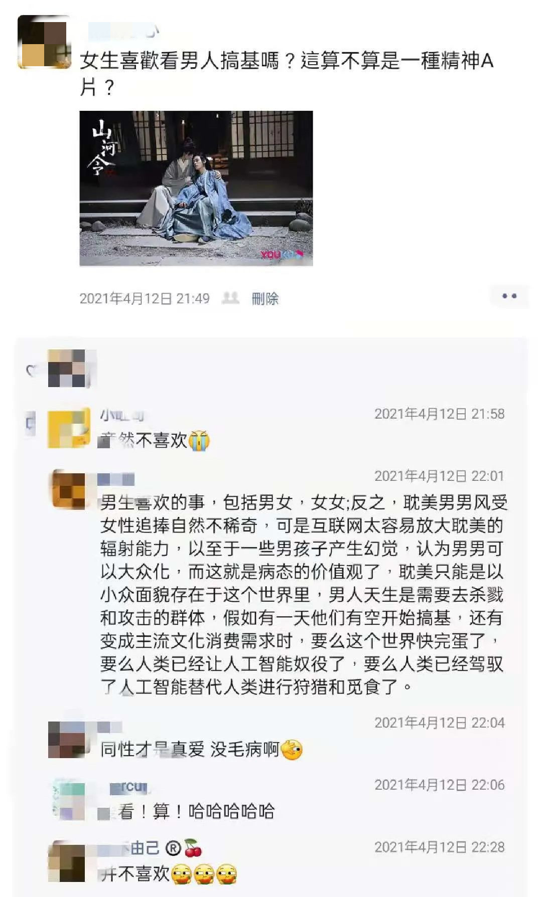 花美男和耽改剧因为受到女性观众的追捧而火爆并不稀奇,可是网络太容易放大这种剧的辐射能力,以至于让一些男生产生了幻觉,认为这些东西可以大众化,这就是一种病态的价值观了。