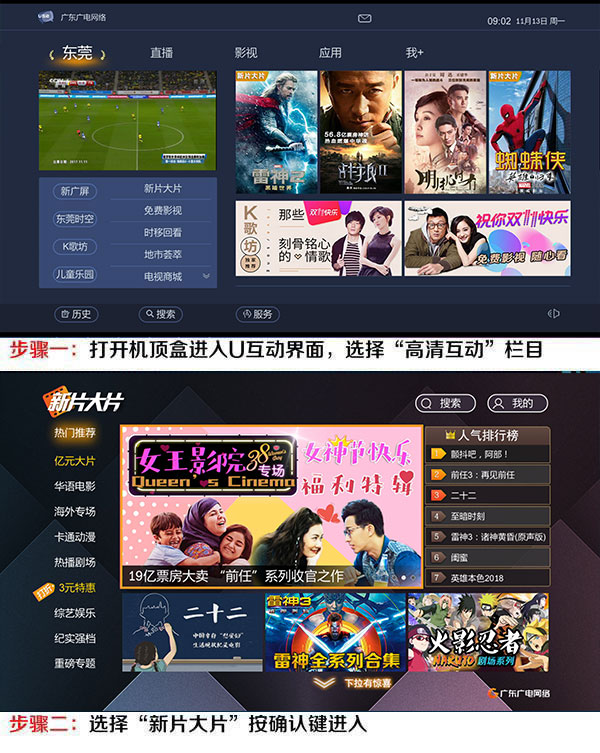 正确的观看路径:打开东莞广电网络智能wifi高清互动机顶盒,选择高清互动 --- 新片大片 --- 电影。