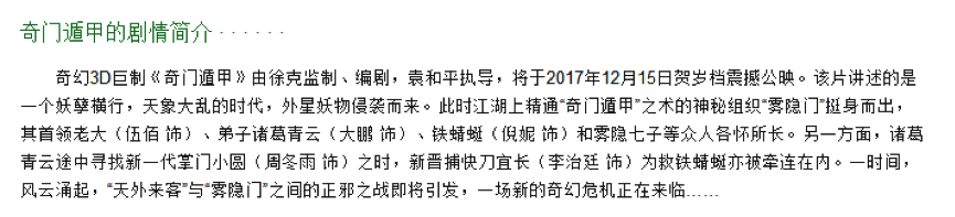 《奇门遁甲》由袁和平执导,讲的是一段古代奇侠大战天外来妖的故事。从剧情简介来看,与天外来妖对战的“雾隐门”众人精通 “奇门遁甲”之术,当然各种千奇百怪的斗法在所难免。