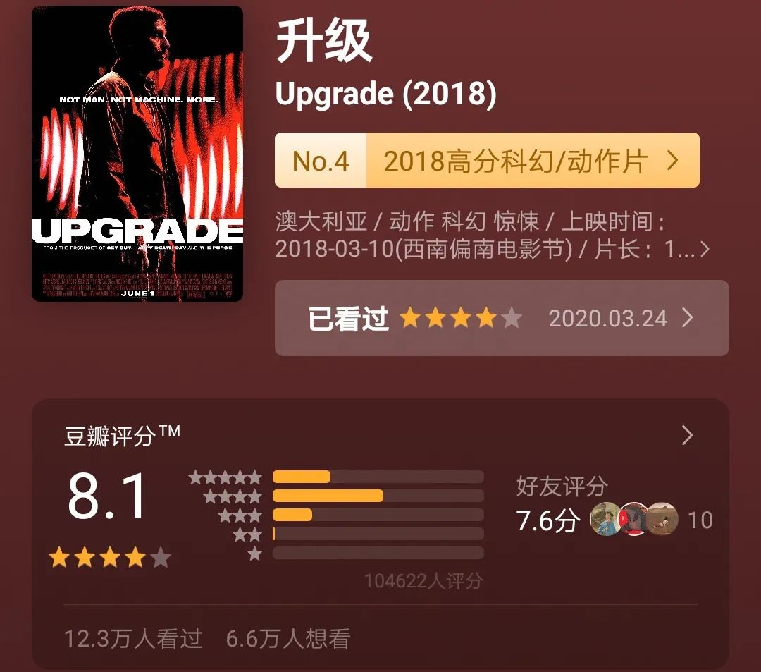 影片动作戏继承了《升级》的特点:主观镜头,像机械舞。女主全程对着空气演,还得表现出被压制的力量感,有点像默剧演员的那种动作,表现的很好。