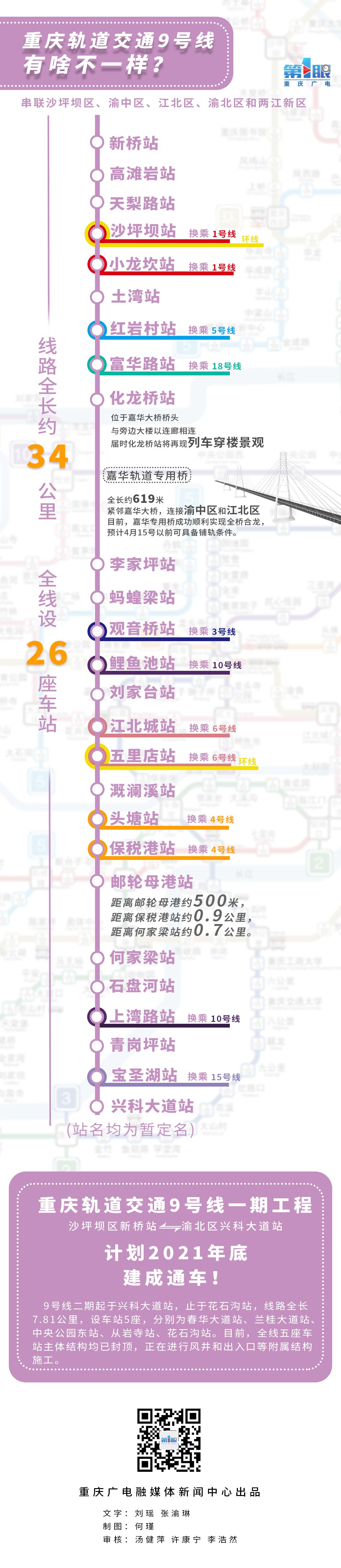 重庆轨道交通9号线一期工程(沙坪坝区新桥站-渝北区兴科大道站),计划2021年底前建成通车。在换乘站的数量、换乘的线路数量、沿途的景色等方面,和其他线路相比,9号线有哪些特别之处?一起来看!
