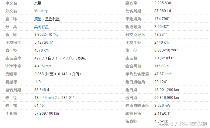 水星相关参数:
