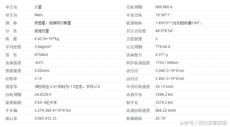 火星相关参数: