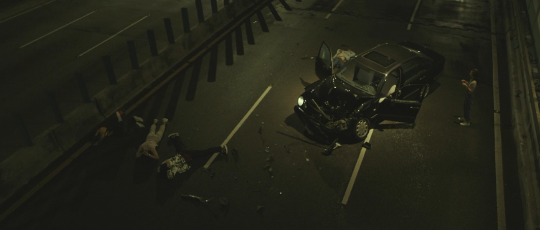 撞烂的小轿车,三个懵逼的高中生,躺在地上昏迷不醒的男孩小鱼。