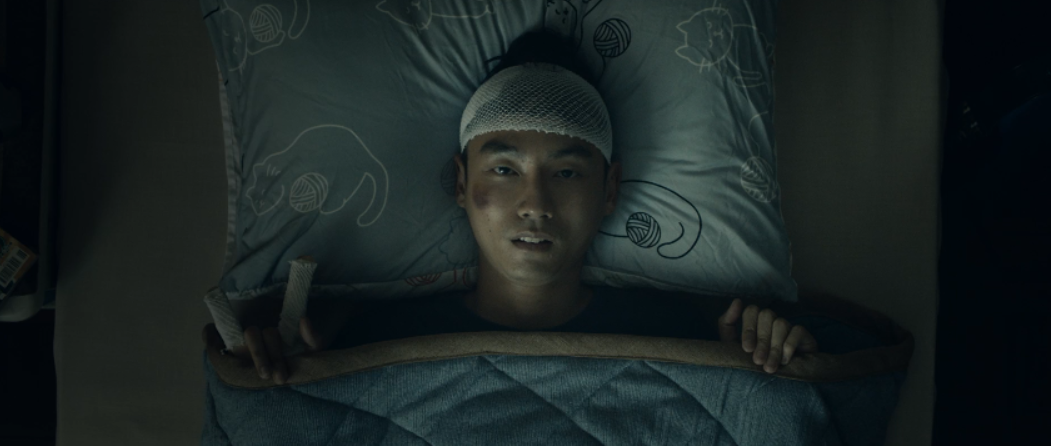 小鱼也好不到哪儿去,头部受伤,戴着头罩。头发束在一起耸立在头顶,像个菠萝。
