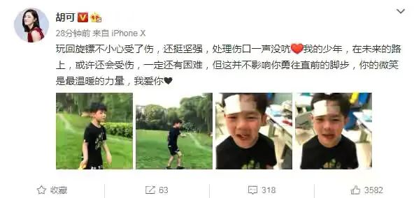 胡可曾在儿子玩回旋镖受伤后,发了一段微博: