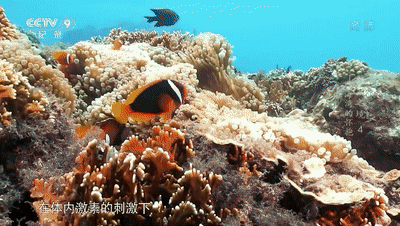 到南海珊瑚丛中的小丑鱼(黑红双锯鱼):