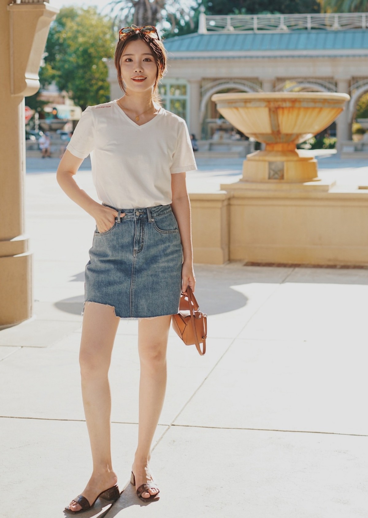 当然,如果是纯白色t恤也是可以穿出时尚感的,避免圆领的设计,选择v领口设计,可以修饰脖颈线条和脸型,提升整体的美感,自然不担心高级感的呈现。纯白色的v领t恤衫,可以搭配浅蓝色牛仔半身裙,精致的短款,展现出青春阳光的少女感,有特色又有个性。