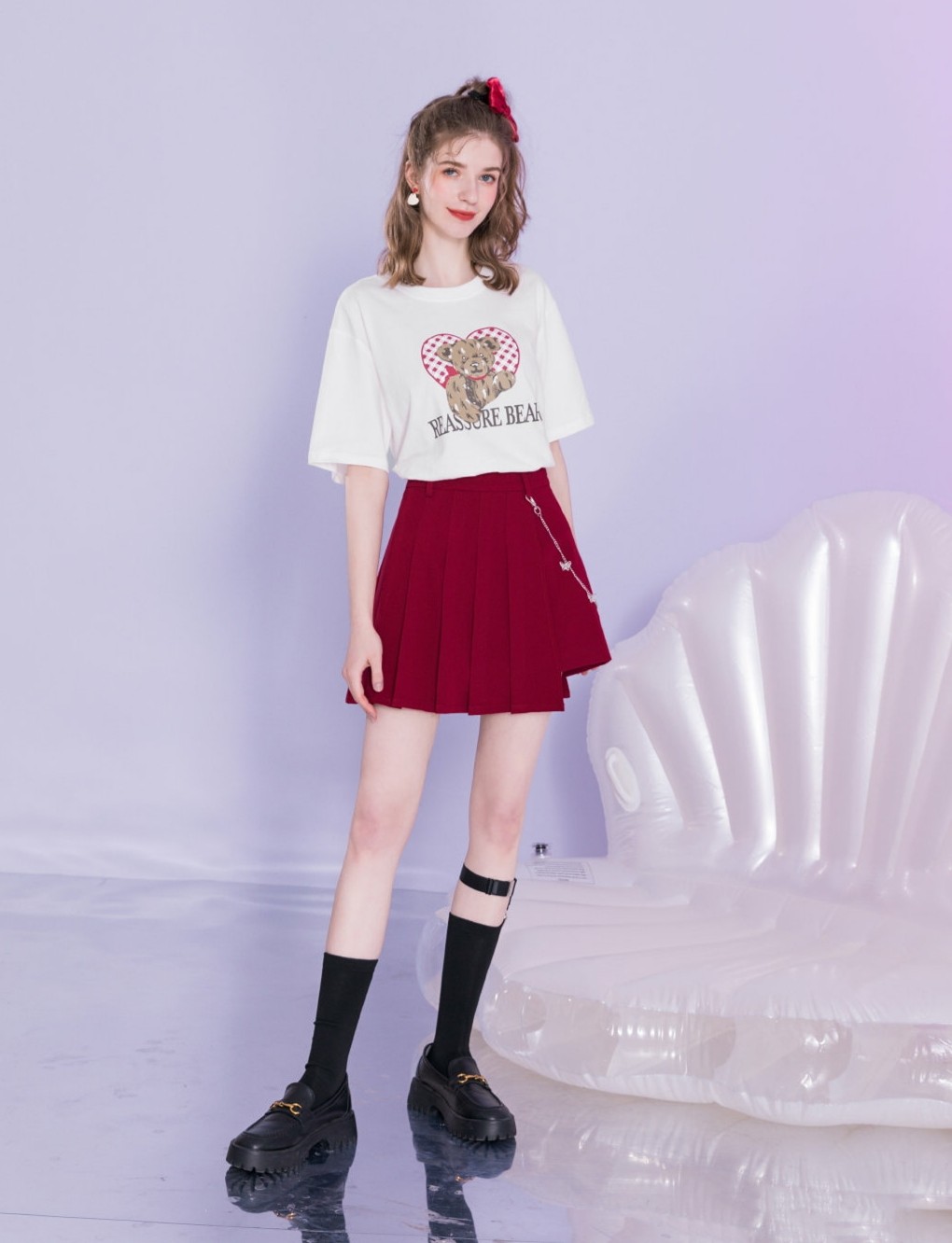 可爱图案的印花t恤衫,在搭配方面也是没有太多的局限性,既可以搭配长裤,又可以搭配红色的短款半身裙,不规则的裙摆设计,充满了个性。醒目亮眼的大红色,一下子点亮整体的色调,展现出不一样的风采。
