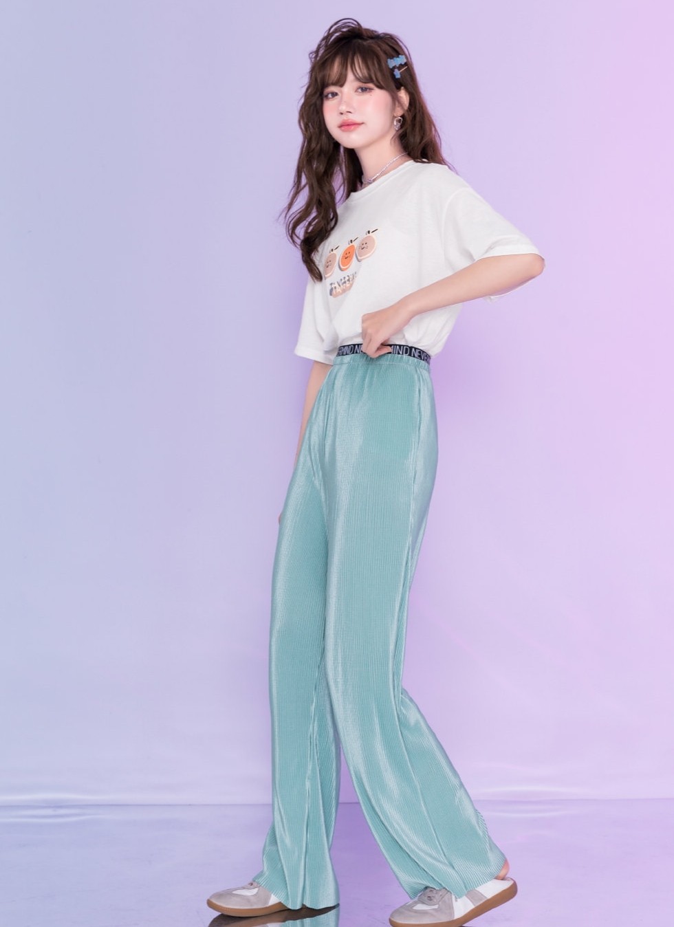 白t恤虽然都是白色的,但却有着各种不一样的花色图案,大家想要穿的青春减龄一些的话,可以选择趣味十足的图案,让你看起来活泼俏皮,有朝气。下半身可以搭配冰丝阔腿裤,选择清新凉爽的浅蓝色,自带光泽感,一下子就冲淡了夏日里的闷热气息,同时显得你气质不俗。