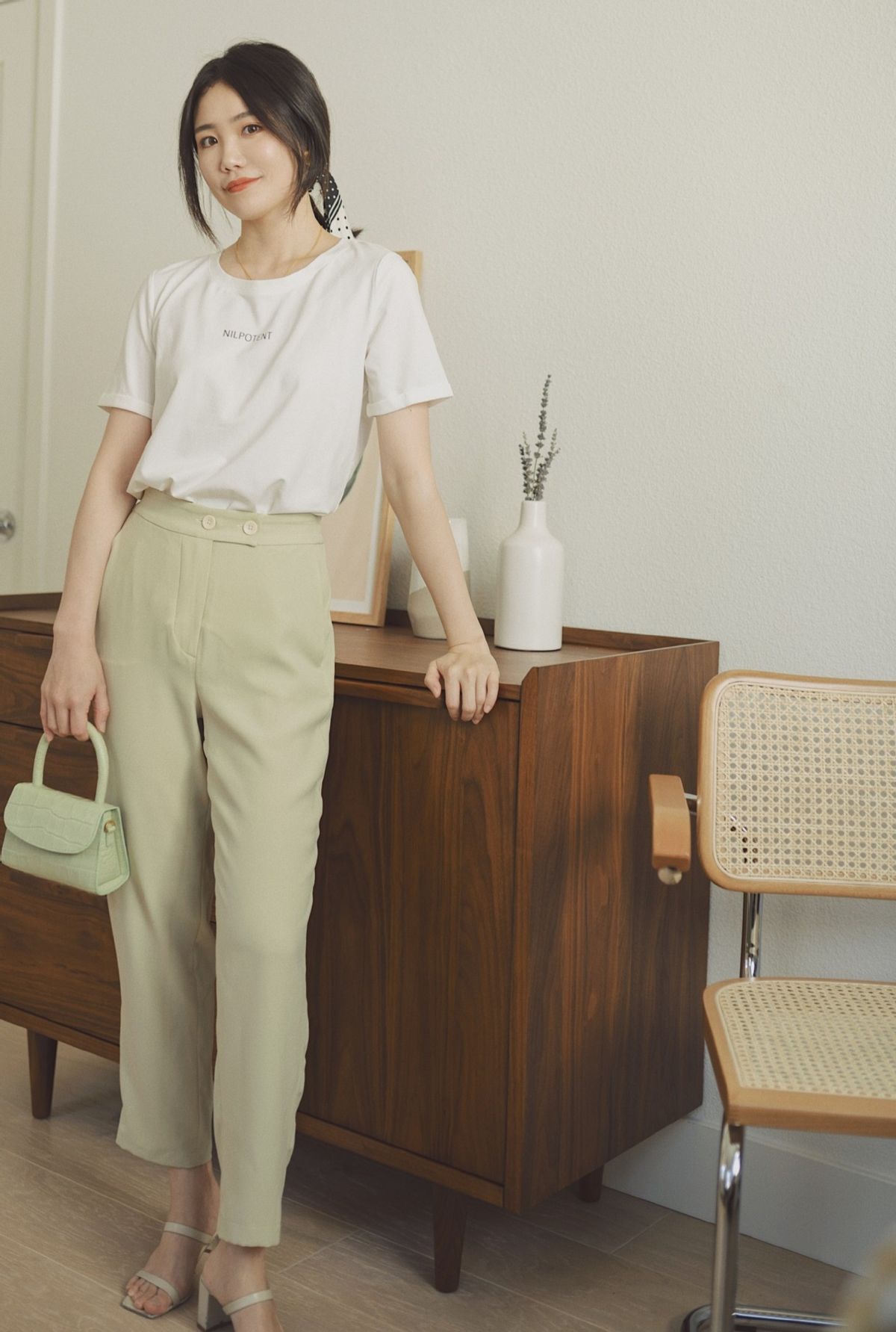 白色的t恤衫是所有女性都可以穿的单品,带有小小的字母装饰,丰富一些细节感,并不会影响整体的造型风格。虽然说,白色t恤百搭但最好搭配一些柔和色调的下装,会比较时髦显气质。如鹅黄色的休闲长裤,搭配起来非常的减龄显嫩,结合全塞衣角的穿法,可以提高腰线,这样让你穿出好身材,对提升气质也是有帮助的。