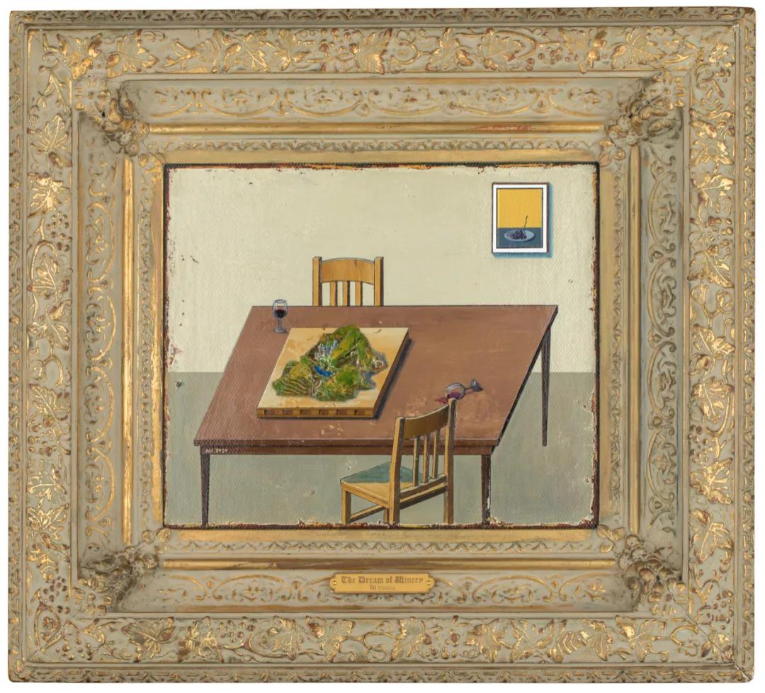 新系列的绘画,是在一批从欧洲各地收集来的的古董画框里描绘的无人空间。他觉得每一个空的古董画框都像是一个带有焦点透视的空房间,几百年过去了,原本的画心迭散,他的新作就是将这些空间重新填充回来。画的内容十分应景:卧室、餐厅、床、工作室……各种各样的室内空间,是过去一年疫情里,全球人民待的最多的地方。