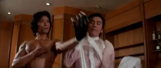 这时间,高先生尚未来到富翁的别墅。但魏啸天派的杀手已提前到了,还是个厉害角色,即“熊虎鹰豹”里的“虎”,大名叫罗虎。饰演者是鹿峰,张彻影片里一贯的反派,小眼睛看着就不像好人。片中,他爆衫了,逢脱必死,也是没跑了。