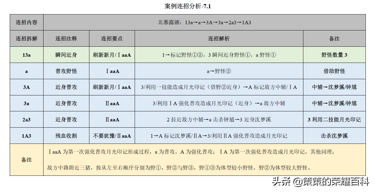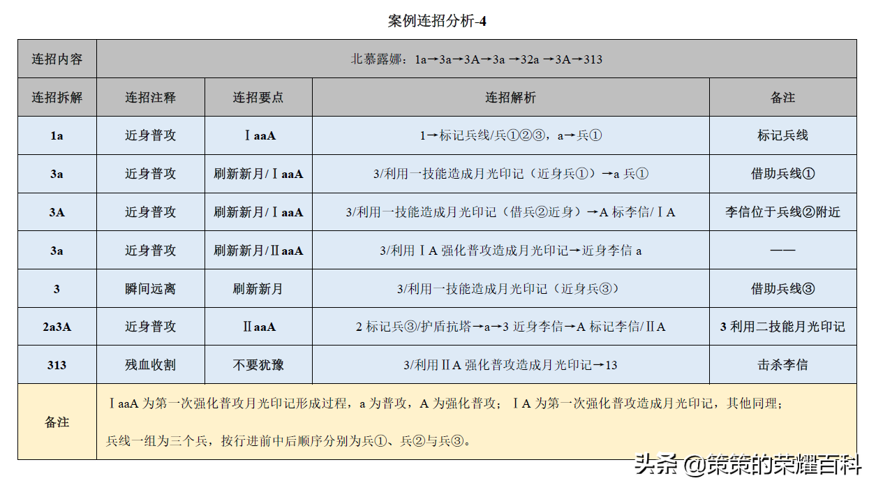 露娜通常操作衔接为,2a3a,二技能打出控制并衔接一次普攻,随后,三技能通过二技能的标记直接再次近身,衔接普攻标记的同时取消技能后摇,若能根据战场情况提前普攻一次,则为a2a3a,也就是说,新月突袭近身之后敌方单位会再被露娜强化普攻标记。