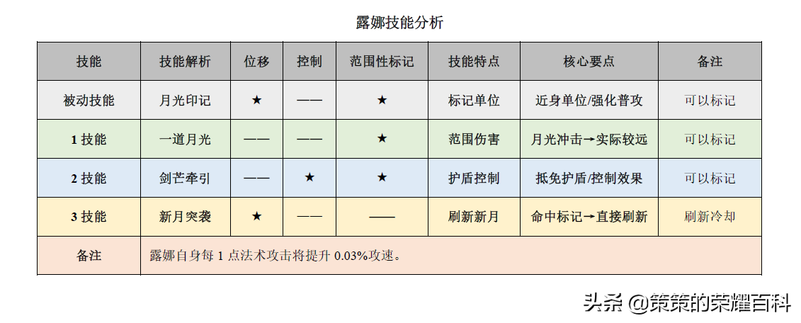 露娜被动技能为,1点法术攻击可提升0.03%攻速。