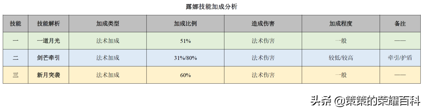 露娜技能均为法术加成,造成法术伤害,二技能护盾加成比例相对较高。