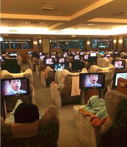 另外一部是《半泽直树》,银行题材,当年播出的时候就被冠上职场“神剧”的称号,收视率很高,有照片为证——这是大结局播出时日本某洗浴中心的场景。