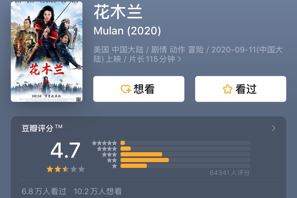 《花木兰》还未在国内院线正式上映,口碑已经岌岌可危,不少买了线上观看的观众对这部电影大失所望,负面评价与日俱增。9月5日《花木兰》在豆瓣正式开分,首拿5.9的低分,然而时间不过过去3天,评分已经降至4.7分。