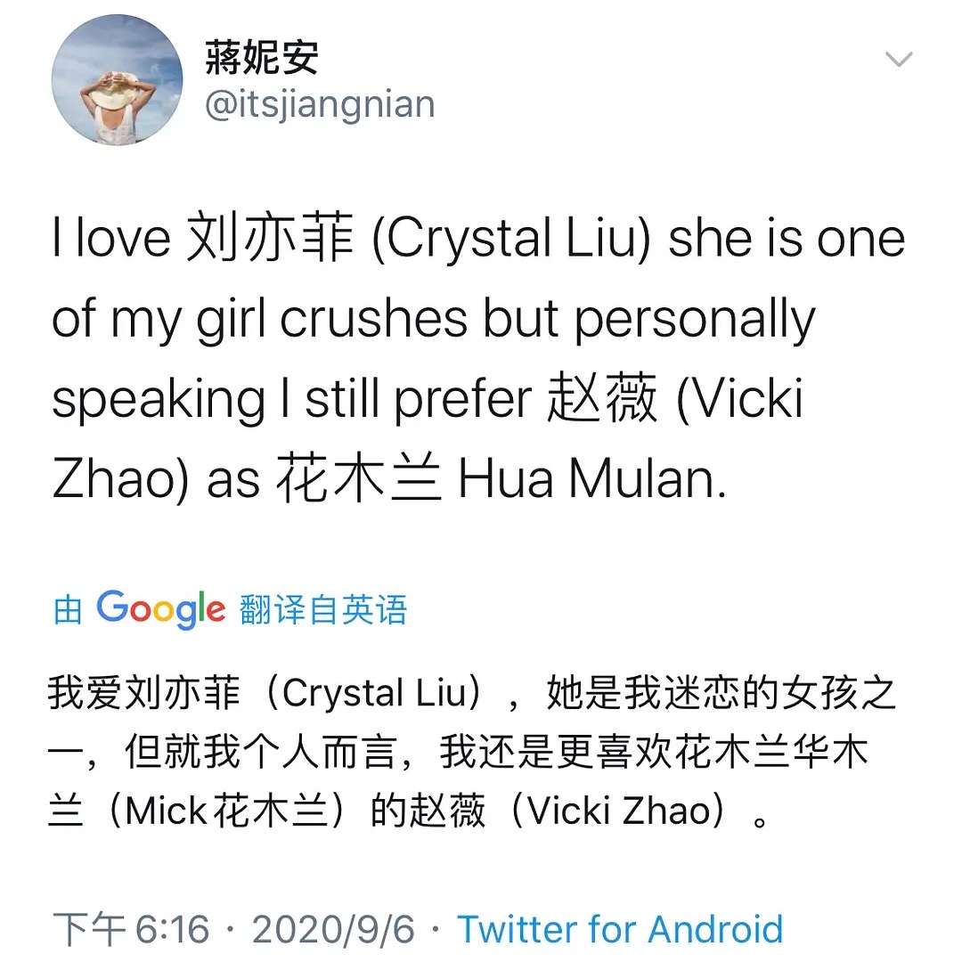 至于刘亦菲,她其实只是一个演员,迪士尼版《花木兰》的口碑问题还是应该由导演买单,而且外网友对她的评价也蛮高的,所以也不用因为赵薇被赞就踩刘亦菲。到底电影拍得如何,现在说再多也是无用,不如等上映后再一辨雌雄。