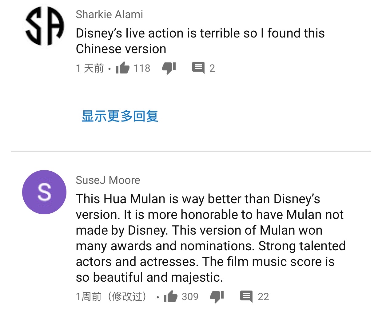 前排的热评就是说刚看完迪士尼版的《花木兰》大失所望,还有说才刚看完迪士尼版最失败的花木兰才来看赵薇版。