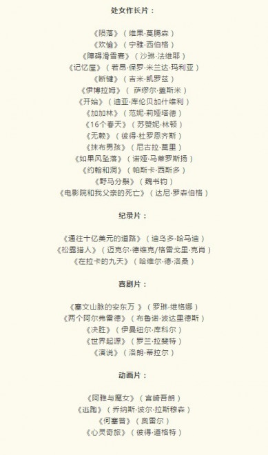 其中,有些影片将在今年秋冬两季发行,有些将在之后前往多伦多、洛迦诺、圣塞巴斯蒂安、纽约、东京等电影节参加竞赛或展映。