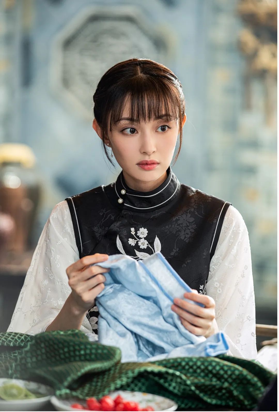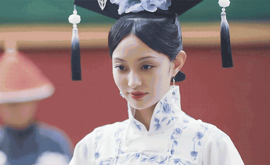 一袭白底青花的宫服让她穿的意蕴十足,一颦一笑都是教养极好的晚清格格风范,而盖玥希五官中天生裹挟的一种古典美则很好的衬托了这份气质;