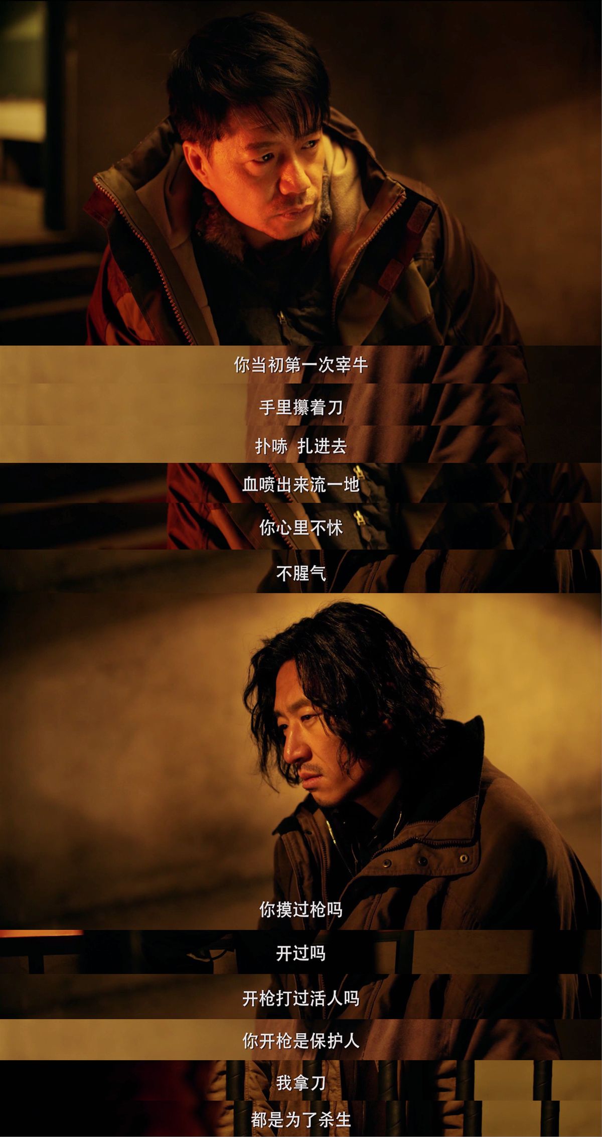 单独聊下白石舟,他在审讯室里与李慧炎的对手戏非常精彩,尤其是他面无表情地说出那段“我拿刀,都是为了杀生”的台词。实际上,在亲眼目睹家中惨遭灭门之后,白石舟逃离了现场,晕倒在雪地里的他被屠宰场的屠夫救回来,成了他的徒弟。从小就生活在仇恨与恐惧的心理阴影下,日复一日地练习屠宰,待在满是牲口的血液与残肢的环境里……他是如何养成复仇心态,从被害人一点点变成加害者,能从台词与演员的表演中得到反复印证。