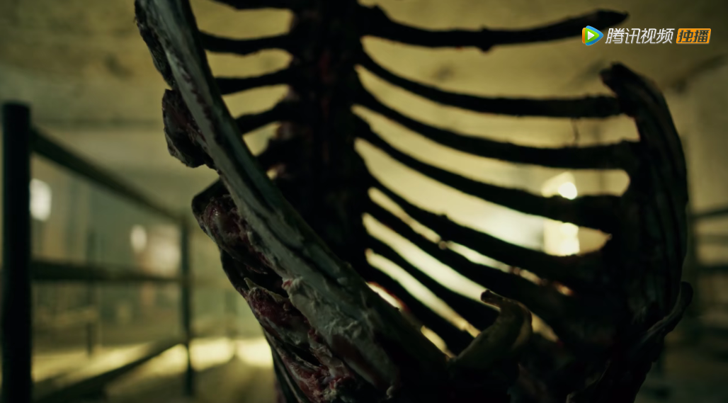 又如下面这类以物为喻体的空镜头,背景打光强调近景中肉骨的“雕塑感”,明暗对比强烈,出现在片头之前,顿生心理的惊悚感。