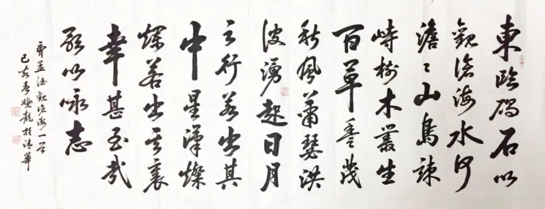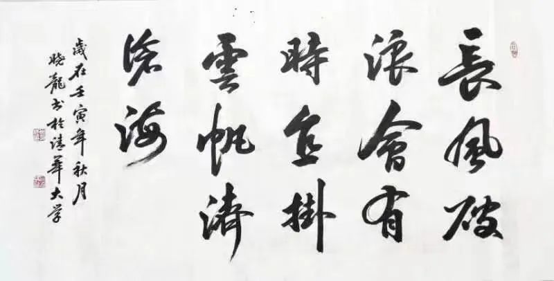 近些年,晓龙先生弃政从文,活跃于京城书坛,有幸结识沈鹏先生,沈先生对其做了高度评价,并提出更高要求:“通读经史子集,心事古代风雅”,这一回,恰似给他注入了强心剂,当今的他,埋头于传统文化的纸堆中,重新面对朴茂高古的汉隶,遒劲苍茫的魏碑,法度严谨的唐楷,体味先哲大贤,默默沉吟,时而摇头晃脑诵读文献,时而悬臂疾书经典质言,如痴如醉,滋养心田。渐而意象神悟,自然流露出他法相衍变的书风;在书法界树立起一面靠功力取胜的旗帜。