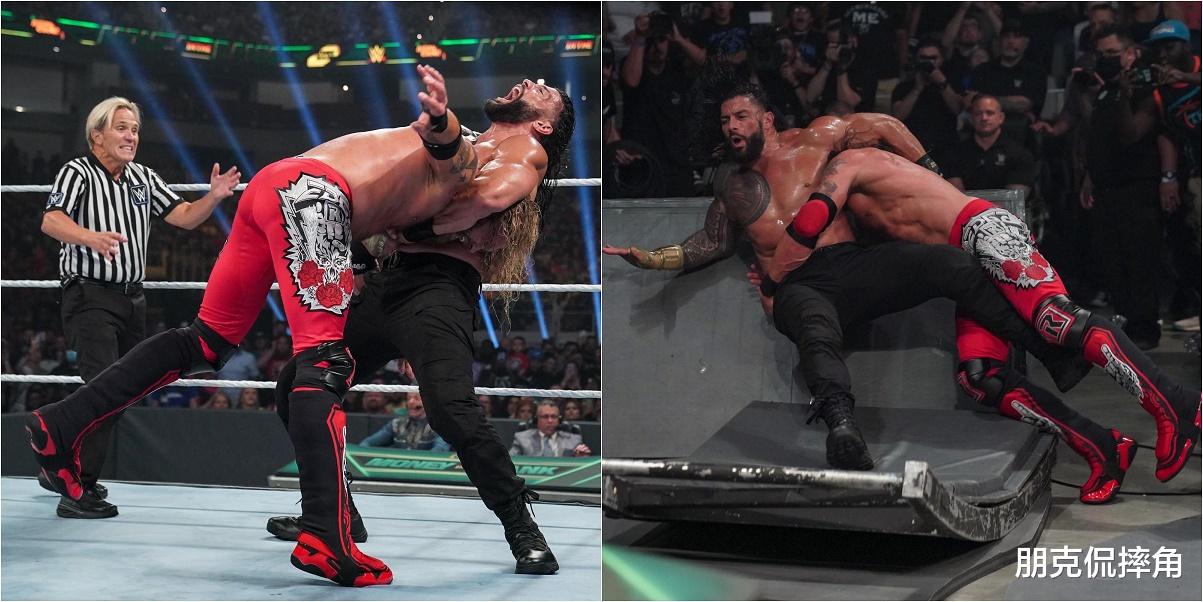 起初两人在台上的较量还算中规中矩,不是拼角力就是拼锁技,当然了,双方都不可能这么顺利就把对手锁拍;辗转至台下以后,艾吉连续两个飞冲肩将罗曼撞塌了场边的护栏,尽管如此,“部落酋长”回到台上仍然能够找准时机使出超人飞拳